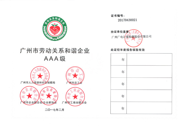 “廣州市勞動關(guān)系和諧企業(yè)AAA級”榮譽(yù)證書