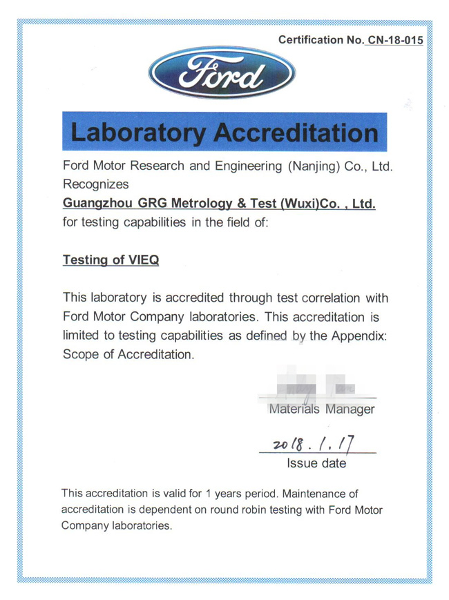 無錫子公司獲得福特汽車第三方實驗室VOC認可