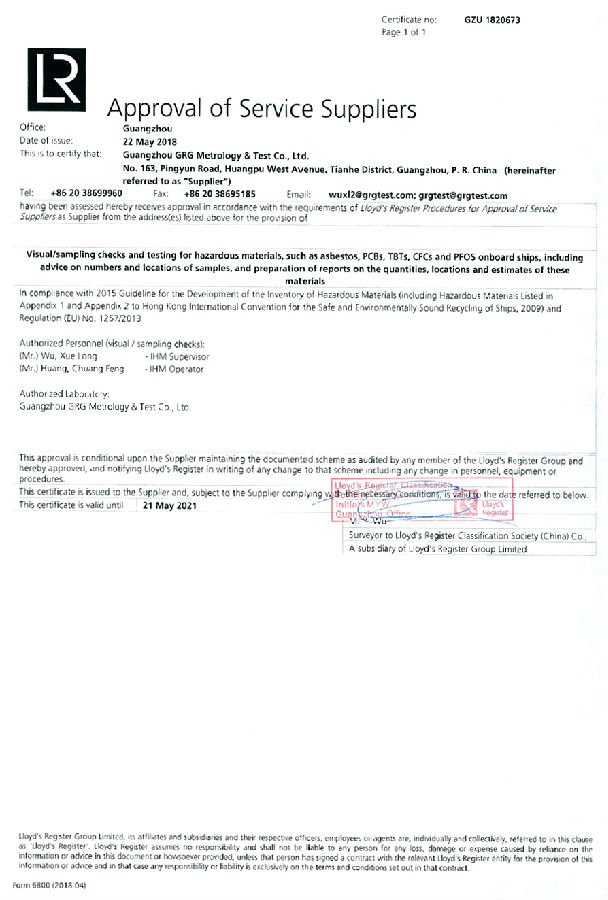 廣電計量新獲英國勞氏船級社船舶有害物質取樣及實驗室檢測機構認可