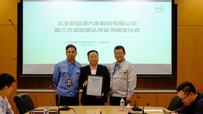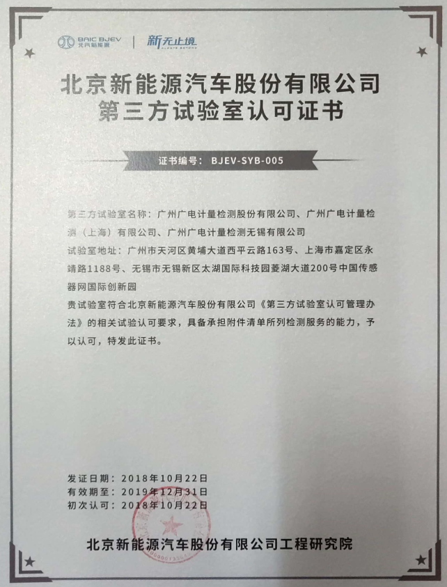 北汽新能源第三方試驗室認可證書