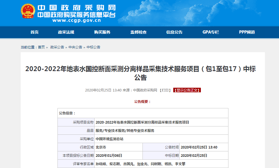 今年1月,為盡可能對全國重要水域的水環境進行監控,持續保障我國地表水采測分離樣品采集工作順利進行,推動“十四五”期間全國水環境評價與質量考核,中國環境監測總站就“2020-2022年地表水國控斷面采測分離樣品采集技術服務項目”進行了公開招標。廣電計量憑借先進的技術能力以及豐富的服務經驗,順利通過專家審核,中標總金額為 22,680,302元,將承擔全國6省(自治區)227個地表水國控斷面的樣品采集以及pH、溶解氧、電導率、水溫、濁度、透明度、鹽度等項目的現場監測工作。