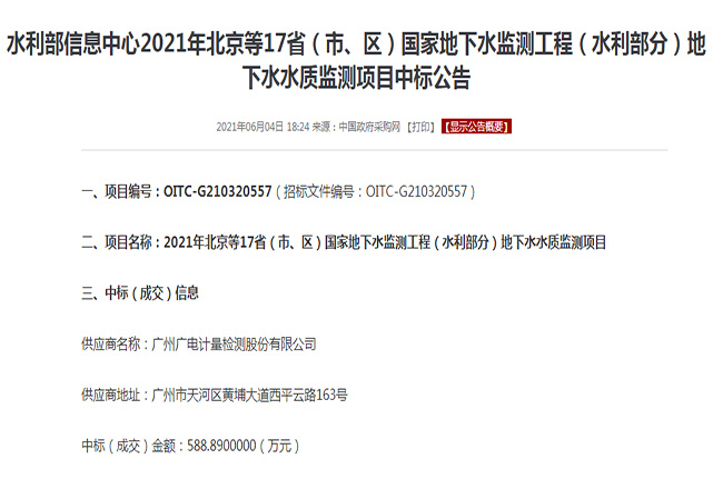 今年6月,國(guó)家水利部對(duì)2021年北京等17省(市、區(qū))國(guó)家地下水監(jiān)測(cè)工程(水利部分)地下水水質(zhì)監(jiān)測(cè)項(xiàng)目進(jìn)行公開招標(biāo),廣電計(jì)量從眾多權(quán)威檢測(cè)機(jī)構(gòu)中脫穎而出成功中標(biāo)。