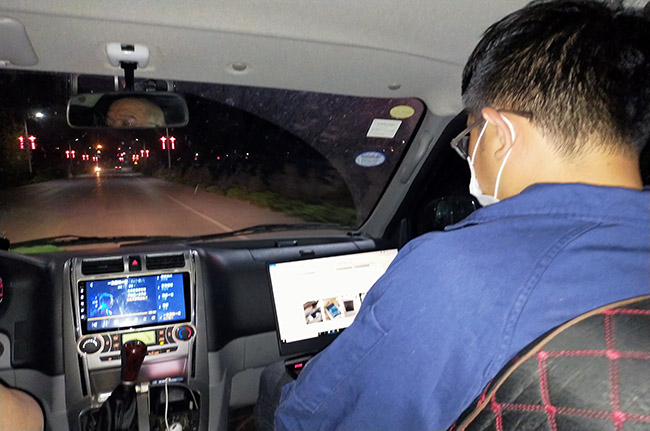 技術(shù)人員夜間采樣結(jié)束后在車上成立采樣信息