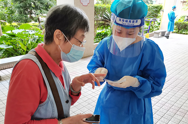 市場綜合黨支部黨員趙敬居住在白云區,此前早已下沉社區多次支援,在4月8日當天更是從晚上8點連續戰斗到第二天早上6點。“累一點不算什么,黨員就是要關鍵時刻站出來,重要時刻沖上去,這是我應該做的。”趙敬說。這次來到白云支援點,她主要負責維護排隊秩序,一邊檢查居民健康碼和核酸碼,一邊關注老人、孕婦等群眾,把他們指引到綠色通道。看似簡單、重復的工作,卻時時考驗著志愿者們的耐心、細心。在這場爭分奪秒的疫情阻擊戰中,每個人都是不平凡的“逆行者”。
