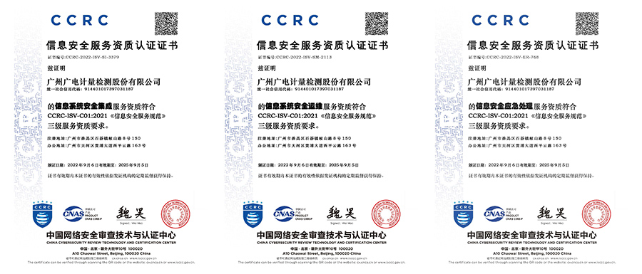近日,廣電計量(002967.SZ)經過嚴格審查,獲得中國網絡安全審查技術與認證中心(CCRC)頒發的信息安全服務資質認證證書,包括信息系統安全集成、信息系統安全運維、信息安全應急處理三項服務資質。這是廣電計量繼今年獲得CCRC信息安全風險評估服務等資質后,再次實現重要突破,形成了信息安全領域“咨詢—運營—檢測—培訓”全覆蓋的服務能力。