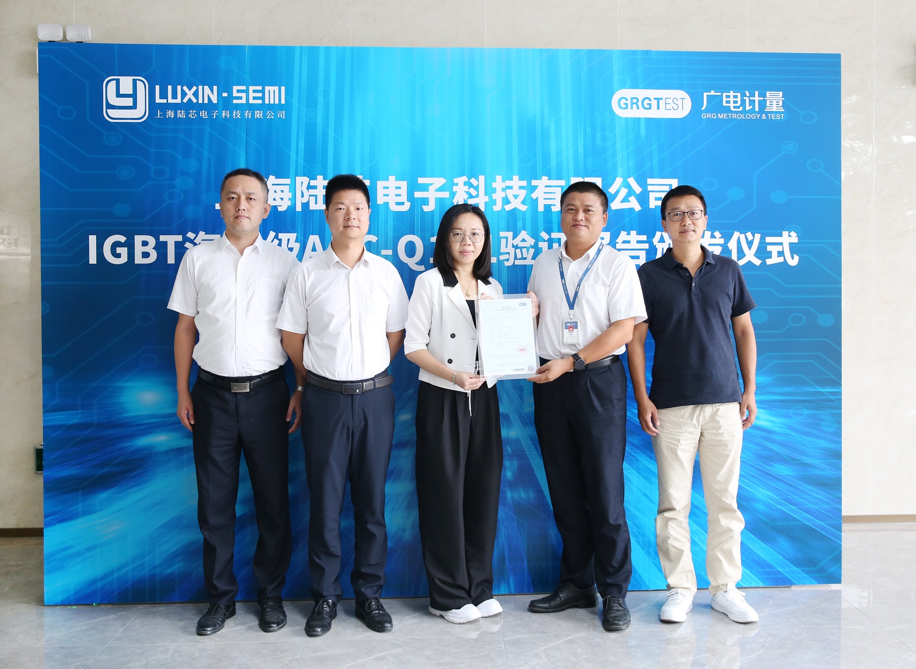 9月20日,廣州廣電計量檢測股份有限公司(簡稱:廣電計量)攜手上海陸芯電子科技有限公司(簡稱:上海陸芯),成功舉辦“廣電計量與上海陸芯合作交流會暨上海陸芯IGBT汽車級AEC-Q101驗證報告頒發儀式”。上海陸芯副總經理黃冬榆、市場總監曾祥幼,廣電計量總經理助理陸裕東、半導體技術副總監李汝冠、失效分析業務副總監代蕾等雙方代表人員出席了本次活動,隨后一同參觀了廣州無線電集團企業展廳和廣電計量實驗室。