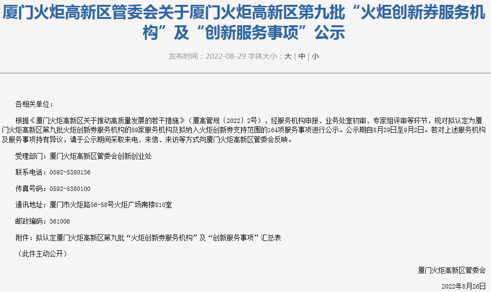 公示網址:http://xmtorch.xm.gov.cn/xxgk/zfxxgkml/glfw/sbxmzj/202208/t20220829_2683991.html