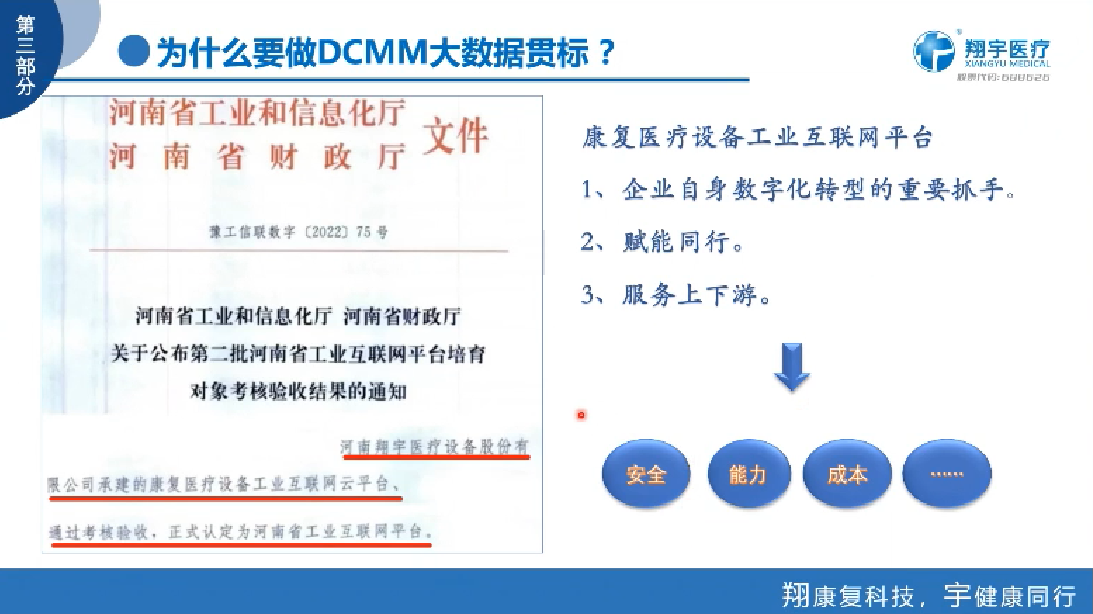河南翔宇醫療設備股份有限公司信息中心總監張偉在主題分享中表示,翔宇醫療今年被正式認定為河南省工業互聯網平臺,并基于此開展DCMM大數據貫標,提升數據管理能力,將有助于工業互聯網平臺建設和推廣,支撐康復醫療設備的互聯互通以及康復醫聯網、康復醫聯體的協同運作。