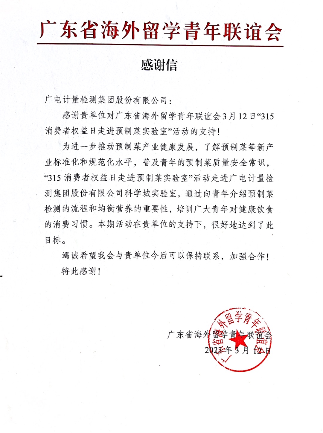 活動結(jié)束后,海青會向廣電計量發(fā)來感謝信,感謝廣電計量對此次活動的大力支持,并希望雙方整合資源、發(fā)揮優(yōu)勢,共同助力預(yù)制菜產(chǎn)業(yè)健康持續(xù)發(fā)展。