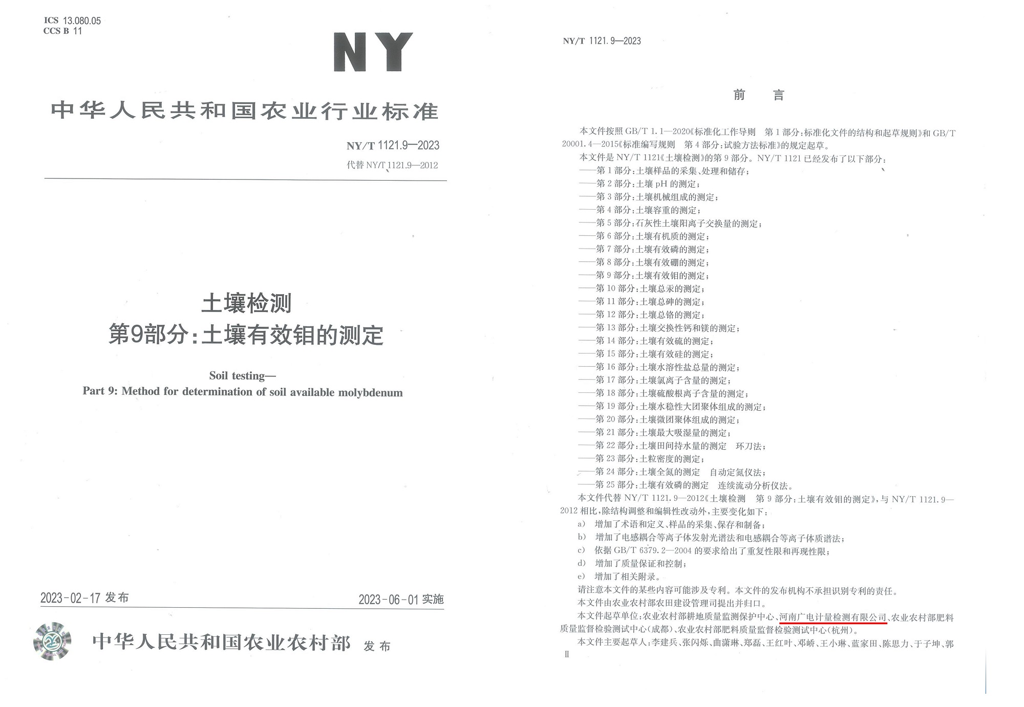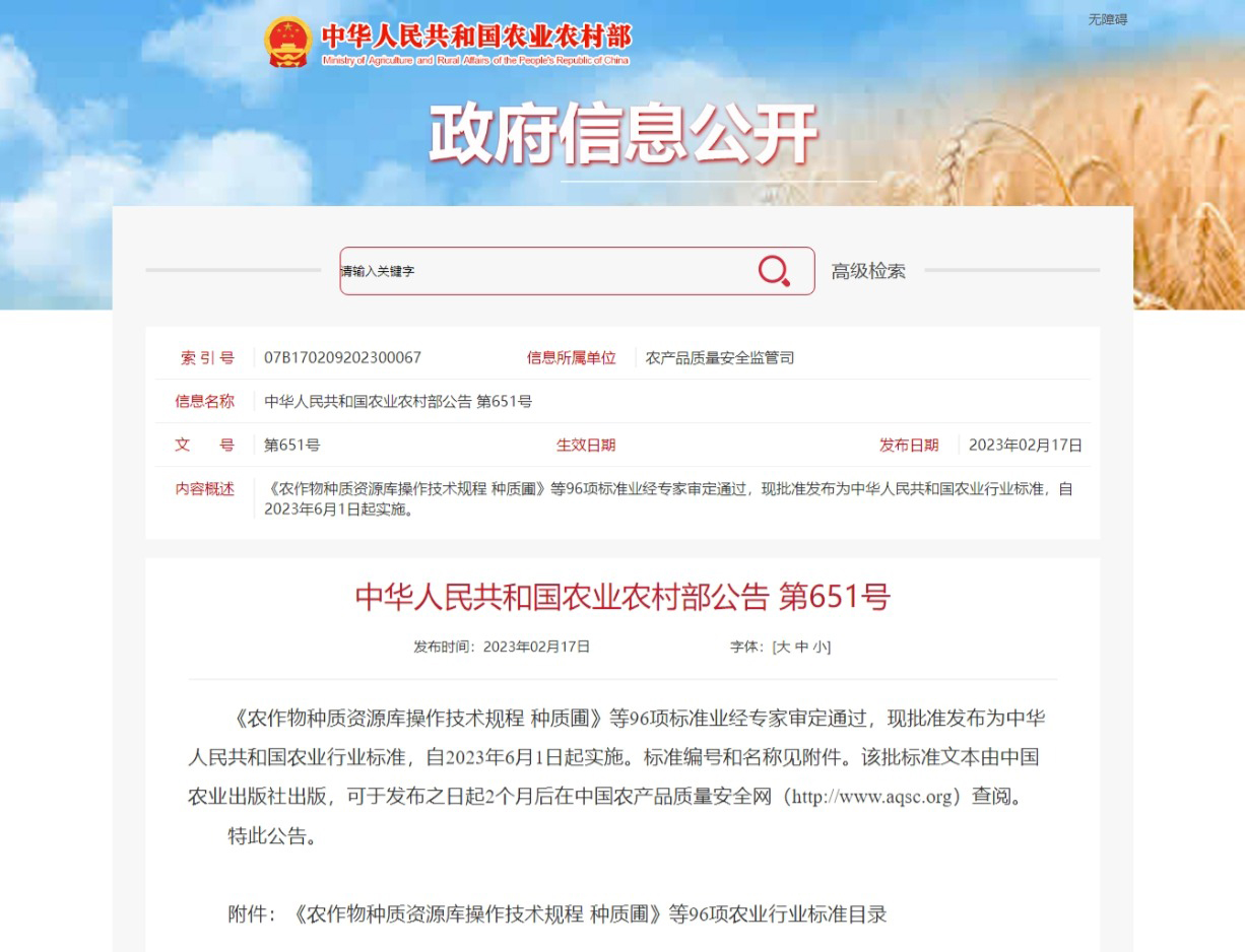 近日,農業農村部發布了中華人民共和國農業農村部公告第651號,《農作物種質資源庫操作技術規程 種質圃》等96項標準將于 2023年6月1日起實施。其中包括廣電計量檢測集團股份有限公司旗下子公司——河南廣電計量檢測有限公司、廣電計量(湖南)檢測有限公司參與起草的NY/T 1121.9—2023《土壤檢測 第9部分:土壤有效鉬的測定》和NY/T 1121.14—2023《土壤檢測 第14部分:土壤有效硫的測定》兩項行業標準。