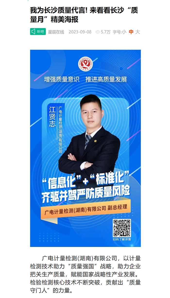 9月8日, 由長沙市政府主辦,湖南湘江新區管委會、長沙市市場監管局聯合承辦的2023年長沙市“質量月”活動啟動儀式暨“質量之聲”主題分享會在世界計算·長沙智谷舉行,正式拉開了長沙“質量月”活動的序幕。廣電計量檢測(湖南)有限公司(簡稱湖南廣電計量)《“信息化”+“標準化”齊驅并駕, 嚴防質量風險》作為質量管控和質量創新提升的典型案例在會上發布。