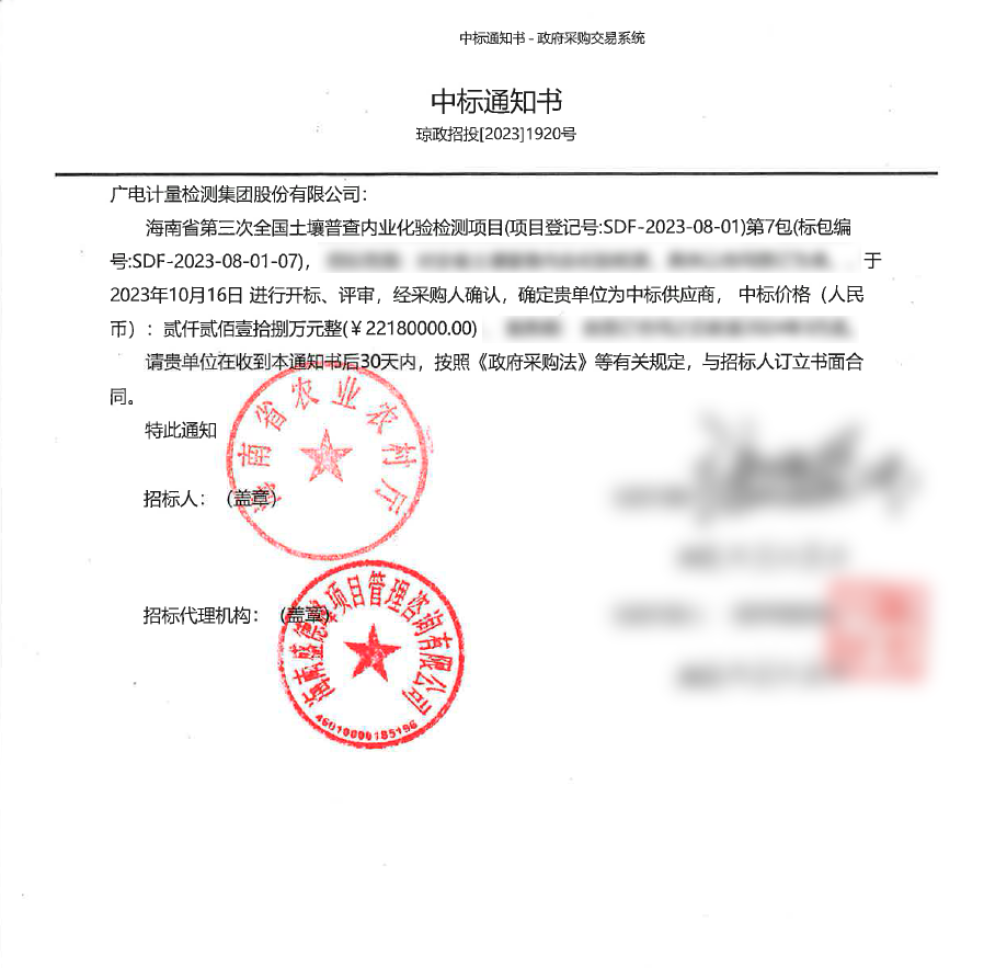近日,廣電計量中標海南省農業農村廳-海南省第三次全國土壤普查內業化驗檢測項目第7包,項目金額2218萬元,體現了主管部門對公司技術能力、質量管理與服務水平的認可。