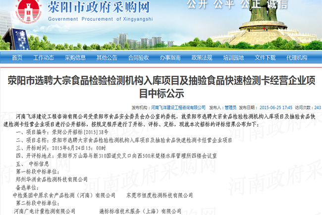 6月24日,廣電計量河南子公司成功中標(biāo) “滎陽市選聘大宗食品檢驗檢測機(jī)構(gòu)入庫項目及抽驗食品快速檢測卡經(jīng)營企業(yè)項目”第二標(biāo)段,項目執(zhí)行時間為2015年6月至2016年底,內(nèi)容包括食品、農(nóng)產(chǎn)品抽樣及檢測一條龍服務(wù),中標(biāo)金額500萬元。