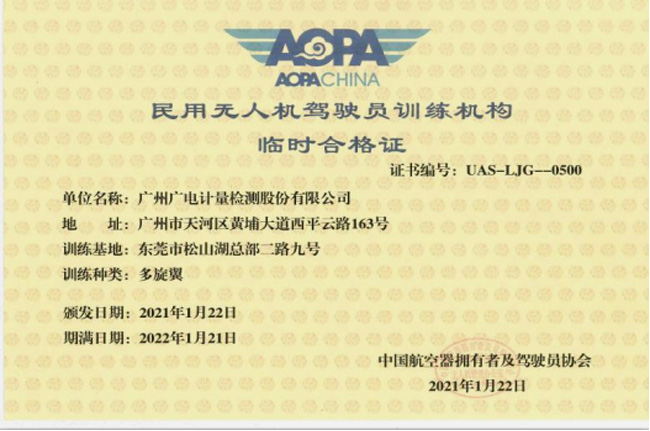廣電計量咨詢培訓事業部無人機飛行學院(以下簡稱學院)隸屬于廣州廣電計量檢測股份有限公司,是經中國民用航空局授權、中國AOPA協會(中國航空器擁有者及駕駛員協會)審定合格的專業無人機駕駛員/機長訓練機構。學院通過培訓無人機技術、無人機行業應用、無人機操控等專業知識,協助學員通過民航無人機飛行考試,取得民航電子執照,并引導學員成為無人機應用行業一流應用專才!