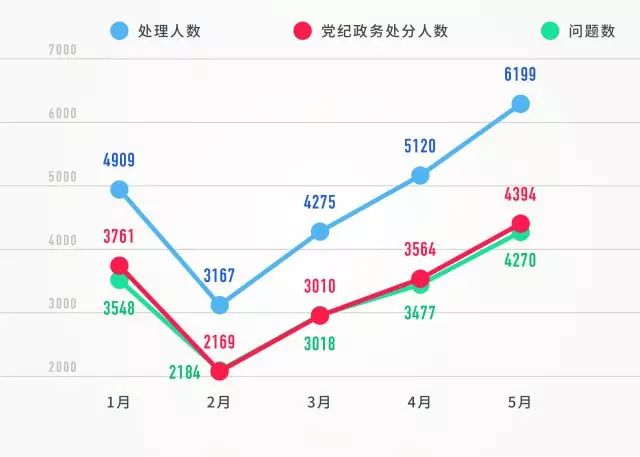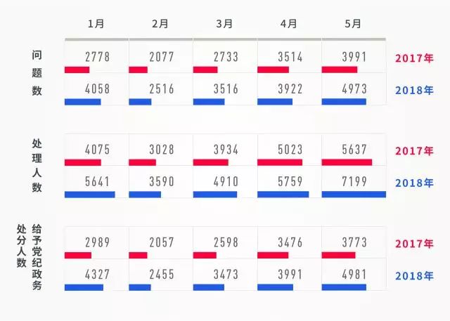 今年1-5月,每月的全國查處違反中央八項規定精神問題數、處理人數、給予黨紀政務處分人數相比去年同期均大幅上升。