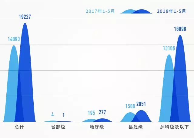 在給予黨政紀處分人數中,除省部級干部人數降低了以外,地廳級、縣處級、鄉科級及以下人數相比同期均大幅提升。特別是,今年1-5月,給予鄉科級及以下人員黨紀政務處分達16898人,相比同期增長28.9%,且占到了處分總人數的87.9%。反映出全面從嚴治黨不斷向基層延伸,持續加大查處群眾身邊的“四風”和腐敗問題力度。