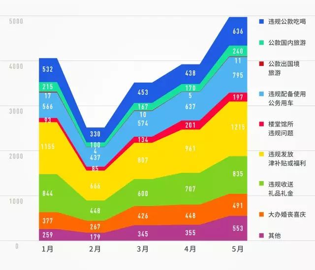 再來看,違反中央八項規定精神問題類型。從1至5月各類查處問題的面積分布圖來看,各類具體問題的查處趨勢也保持了較穩定的增長態勢。值得注意的是,違規發放津補貼或福利、違規收送禮品禮金、違規配備使用公務用車、違規公款吃喝、大辦婚喪喜慶等問題類型,相比同期仍是所有問題類型的“大頭”(占據前5名),占比仍超80%。數據顯示,這些老問題,仍需下大氣力糾治,持之以恒,久久為功。