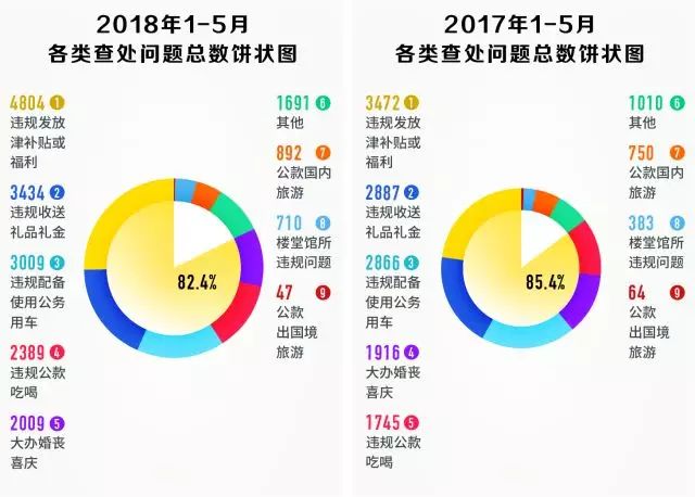 2017年、2018年1-5月各類查處問題總數餅狀圖,違規發放津補貼或福利、違規收送禮品禮金、違規配備使用公務用車、違規公款吃喝、大辦婚喪喜慶等“老問題”占比較大,均超80%。