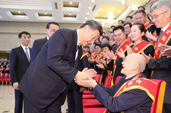 2019年7月26日,習(xí)近平在北京會(huì)見(jiàn)了全國(guó)退役軍人工作會(huì)議全體代表。合影留念時(shí),一名94歲的老人坐在了習(xí)近平與李克強(qiáng)中間。