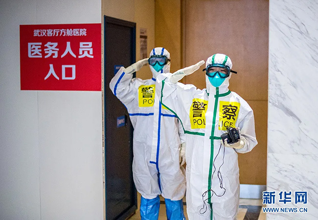 2月25日,在武漢客廳方艙醫(yī)院,來自武漢市東西湖區(qū)公安分局的民警張錦星(右)與同事劉晨在進(jìn)方艙前向同事敬禮。新華社記者 肖藝九 攝