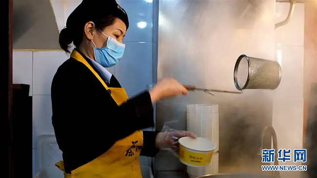 3月28日,“蔡林記”熱干面館店長周秋香在做熱干面。新華社記者 熊琦 攝