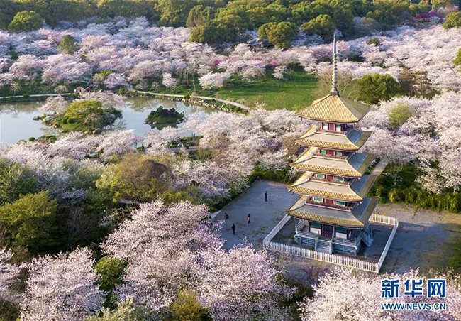 3月20日拍攝的武漢東湖櫻園(無人機(jī)照片)。 新華社記者 熊琦 攝
