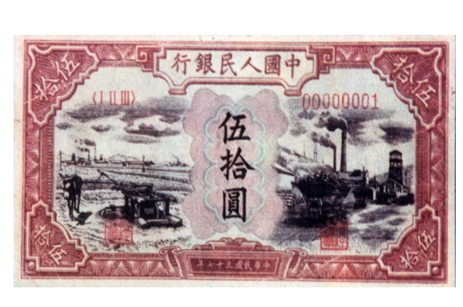 1948年12月1日,中國人民銀行發行第一套人民幣,“中國人民銀行”六個字由當時的華北人民政府主席董必武同志題寫。第一批發行的人民幣有10元、20元和50元三種券別,首先在華北、山東和西北三大解放區流通使用。圖為50元一號人民幣。西柏坡紀念館供圖
